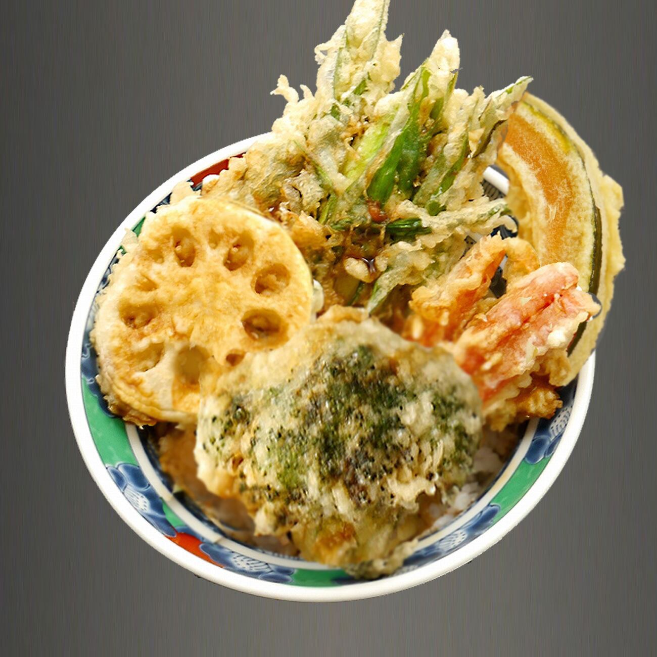 季節の野菜を天丼に仕立てました。 九条葱、南瓜、レンコン、にんじん、ブロッコリー 写真と内容が異なる場合が御座います。